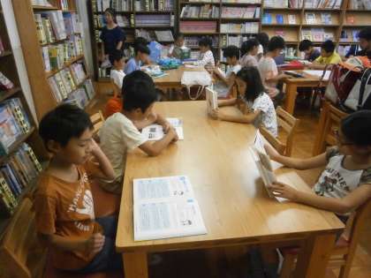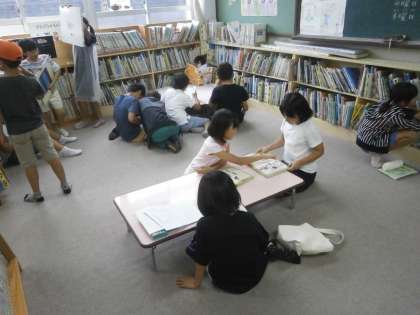 図書室では,3・4年生が一緒に読書を楽しんでいました。