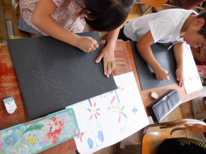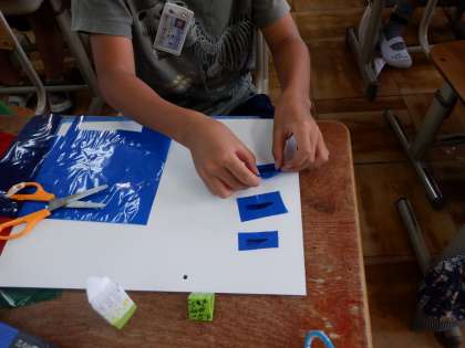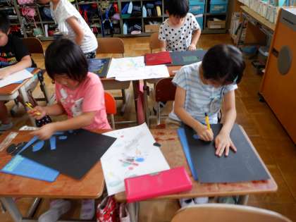 今日は初めてカッターナイフを使いました。最初に,使い方を学習し,安全に気を付けてゆっくりと台紙を切っていきました。慣れないので難しかったのですが,だんだんとコツをつかんで切れるようになっていきました。切り抜いたところには,カラーのセロファンを張りました。続きは来週です。