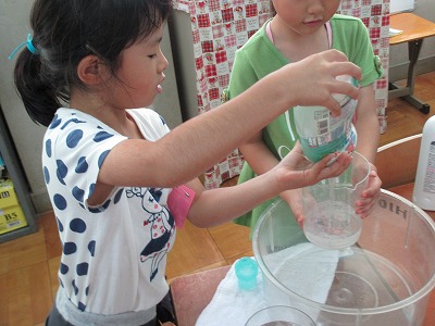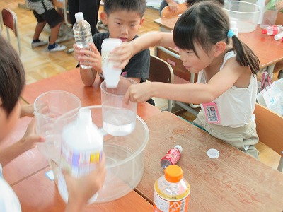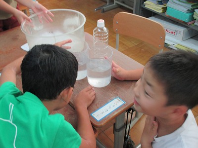今まで長さを比べてきましたが,今回は水のかさの比べ方を考えました。移し替える方法,同じ大きさの容器に入れて比べる方法など,子どもたちはいろいろな方法を考え,自分たちが持ってきた容器のかさを比べていました。