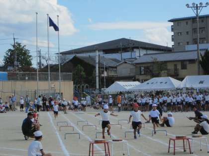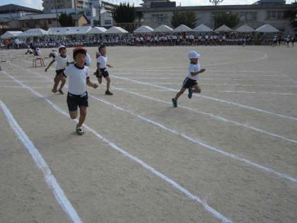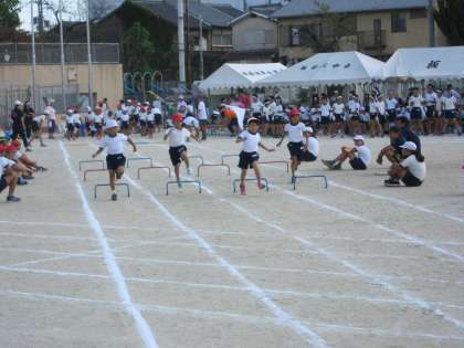2年生の障害物競走です!ミニハードルを跳んで,タンバリンを叩いて,最後にダッシュ!上手に障害物をクリアして走りきることが出来ました!