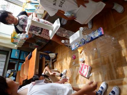 家から集めてきた廃材を使って,どんな遊びができるか考えました。積んだり転がしたり並べたり,いろいろ試しているうちに,どんどん遊びが広がりました。