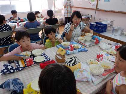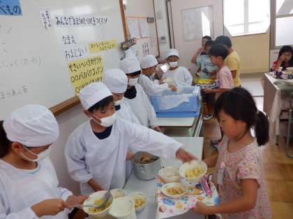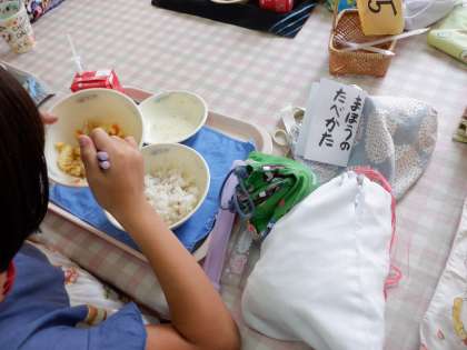 ランチルームで職に関する学習をしました。栄養教諭と『苦手な食べ物を食べるおまじない』を考えました。給食の配膳も教室とは勝手が違いますが,スムーズに配膳できました。さすがは2年生です。給食が配られると,みんな和やかに楽しくいただきました。苦手な食べ物を前に,早速おまじないを試して,「やった。食べられた。」と喜んでいる人もいました。