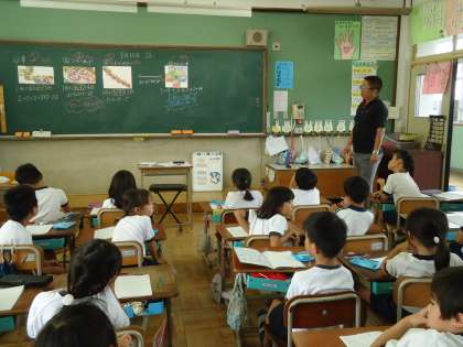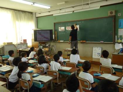 掛け算の学習に入りました。教務の先生の野田先生に教えてもらいました。同じ数ずつの乗り物に乗っているときに 掛け算で計算できることなどを学習しました。