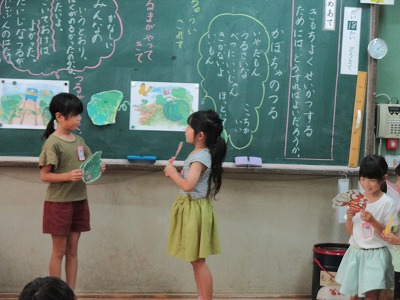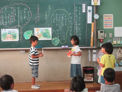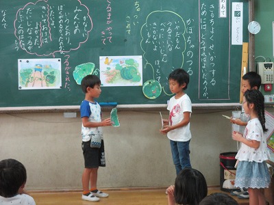 このお話は,かぼちゃがわがままで,自分のつるを好き勝手に伸ばし,周りに迷惑をかけた末,車に大切なつるを切られてしまいます。切られてしまってから,かぼちゃは自分の行動を反省します。子ども達は,かぼちゃになって反省の言葉を考え,みんなの前で発表しました。