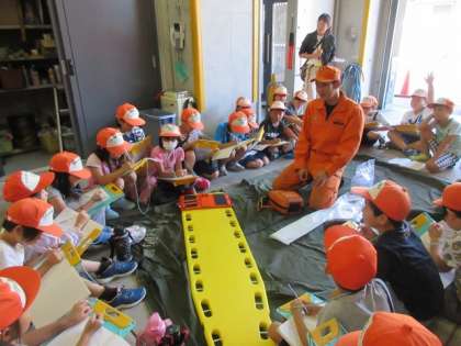 南浜消防出張所へ見学に行きました。消防車や救急車にのっている道具を見せていただいたり,1分でもはやく人を助けるための工夫をきかせていただいたりしました。子ども達は,普段見れないものや聞けないお話に興味津々でした。