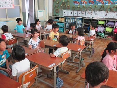 1年生になって,初めての英語活動をしました。今回は第1時間目ということで,「あいさつのしかた」を学習しました。ボランティアの松田先生に発音のサポートをしていただき,たのしく活動できました。