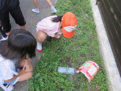 日なたと日かげの地面の温度の違いを調べました。温度計をじーっと見て読んでいました。