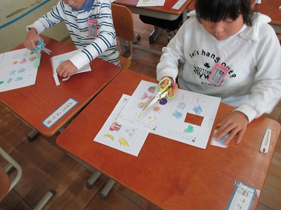 漢字の成り立ちを学習し,物の形や様子からできた漢字の絵カードを使って、「暗号文」を作りました。暗号文という響きに子どもたちの意欲は一層増したようです。できた暗号文をグループで読み合いました。