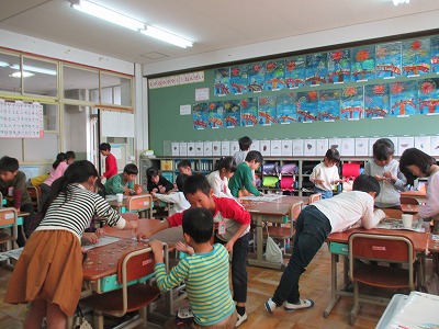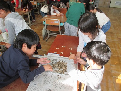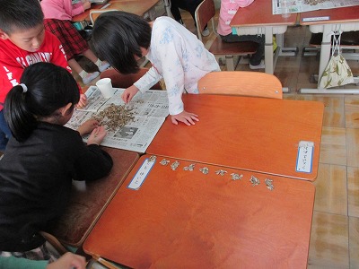 ひまわりの種取りをしました。1つの花からいくらぐらいの種がとれるのか,種はどのように並んでいるのか,子ども達は興味津々で種取りをしていました。算数で学習した10個ずつのまとまりを作って数えていきました。まだ,学習していない数になっていたため,10のまとまりがいくつあるかを数えました。4この花から『3203個』の種が取れました。