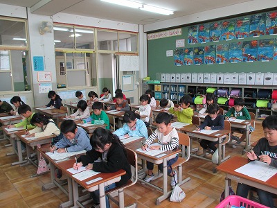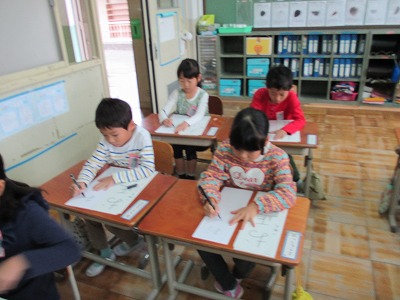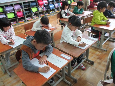 子ども達はフェルトペンを使って,書初めの練習を始めました。少し時期は早いのですが,京都市では書初め展が行われ,学校から作品を出品します。ペンは鉛筆とは違い,一度書くと消すことはできません。なので,子ども達は集中して,真剣に書いていました。