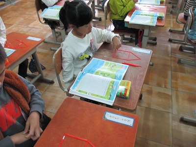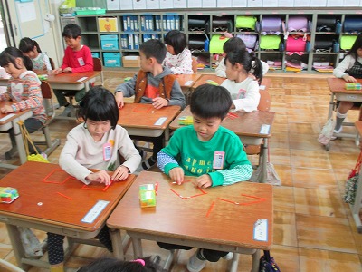 今回は、棒をつかって家や旗、船や魚などの形を作りました。棒の先端がどこについているのか,何本棒を使った形なのかを考えながら活動しました。