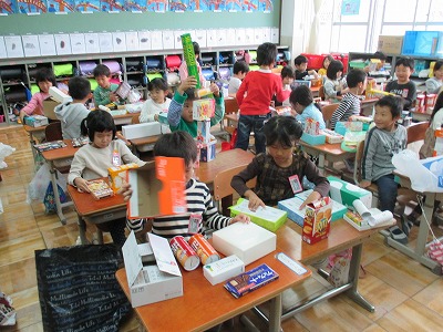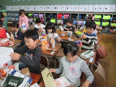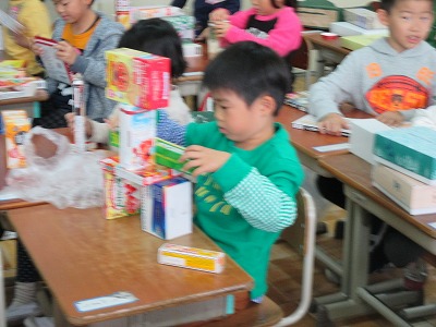 家から持ってきた箱を組み合わせたり,積み重ねたりしながら自分の作りたいものを見つけて作る学習をしました。初めはうまくつかなかったのですが,接着テープを輪にして箱と箱を付けられるようになりました。動物や乗り物,建物など,子ども達は自分の作りたいものを熱心に作っていました。