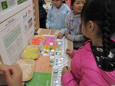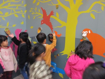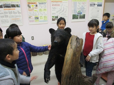 研究所の所員の方から話を聞いた後,施設の中を見学しました。研究所の敷地にやってきた動物のはく製を触ったり,同じ大きさの木でも,重さが全く違う木の展示物を実際に持ってみて,違いを確かめたり,木の香りを嗅いでみたりと,子ども達にとっては興味深い物ばかりでした。予定の30分間はアッと言う間に過ぎてしまいました。施設を出るときにはもっと遊びたいと思っている子が多くいました。