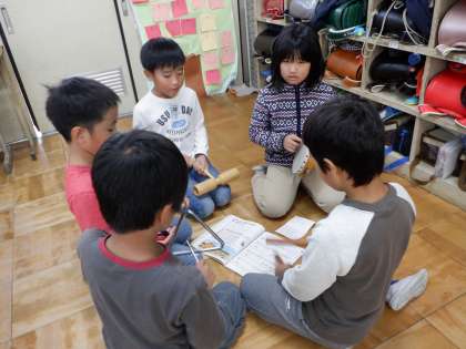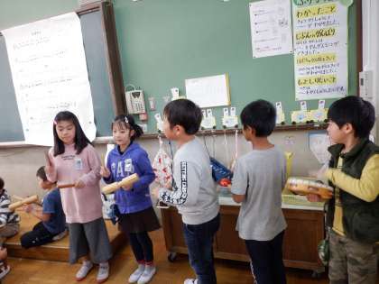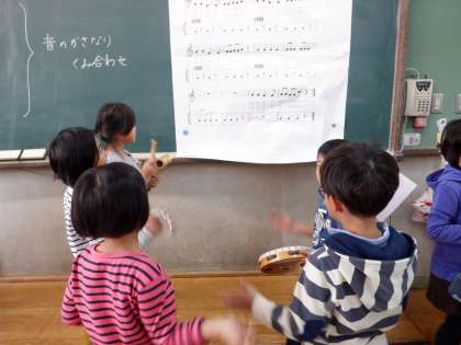 いろいろな打楽器の音色の特徴を生かして「かぼちゃ」の合奏をしています。選んだ打楽器の音色に気を付けて演奏できるように,グループで話し合ったり教えあったりしながら,練習を進めています。次の時間には,『歌うグループ』『演奏するグループ』『聴くグループ』に分かれて,いろいろな音を楽しみます。