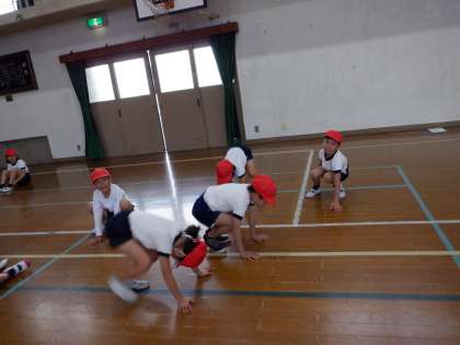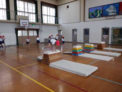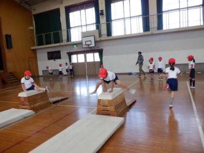 とびばこあそびは,準備や後片付けが大変ですが,安全に気を付けて素早く準備ができています。ねらい1では,今できる技で高さに挑戦しています。1年生の時にできていた技や,2年生になってからできた技などで,それぞれが自分の目標に向かって挑戦して今うす。ねらい2では,少しがんばればできそうな技に挑戦しています。低い高さの跳び箱や,小さな跳び箱,高さの違う跳び箱を置いてなど,工夫した場を使って練習しています。「○○さんは軽く踏み切っていて,良いと思う。」「縦開脚とびは,遠くに手をついた方ができそうな気がする。」など,跳び方を考えたり友だちの良いところを見つけて,学習を進めています。