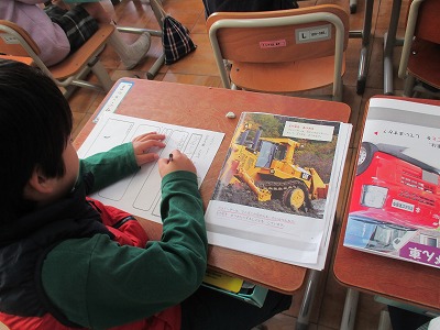 自分たちで『じどう車づかん』を作るために,車の図鑑を見ながら,調べたい自動車の「しごと」とそのための「つくり」について調べています。