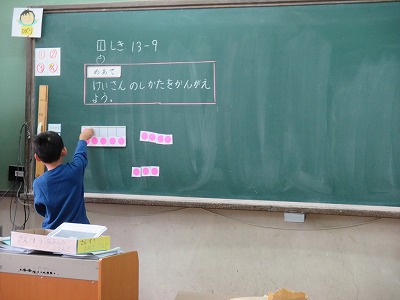 二つ目のひきざんの単元に入りました。13−9のように一の位からひけない計算を,ブロックを使って考えました。自分が考えた方法をみんなに説明する力も付いてきました。今はブロックを操作して計算しています。