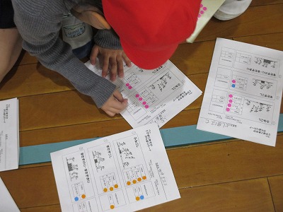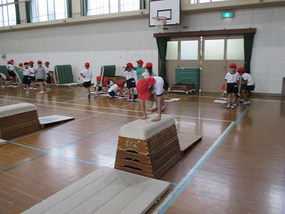 跳び箱の学習は3時間目となり,準備の仕方も手際よく進めることができました。跳び方では,挑戦する技もふえ,手の付き方や踏み切り方等,自分のめあてに向けて練習しています。挑戦した技やうまく跳べればカードにシールを貼っています。