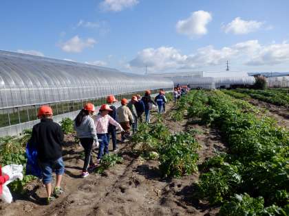 いよいよ畑へ移動。待ちに待った大根ほりです。「土の中の長さはほとんど同じなので,土から出ている部分が長い方が大きい大根だよ。」と山口さんに教えていただきました。みんな,どの大根を抜くか,じっくり選んで抜きました。思っていた以上の大きさだったので,みんなびっくりしました。「見て見て,こんなに大きい。」「重たいよー。」と思わず声が上がりました。
