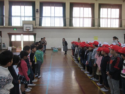 13日(金)に,伏見板橋幼稚園の年長さんを学校にお招きして「秋をたのしもう」の会を開きました。子ども達は前日にリハーサルを行ったのですが,当日の準備を短時間で済ませ,たのしい雰囲気の中で会がスタートしました。初めの言葉や終わりの言葉では、大きな声で発表することができました。店を回る時には,幼稚園の人と手を繋いで回っている子どももいました。店番の人は丁寧に遊び方を説明することができました。