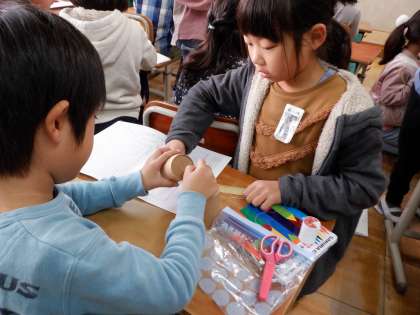 説明書と材料をプレゼントして,一緒に作りました。1年生と一緒に作っている2年生はとてもやさしい顔で,楽しそうでした。