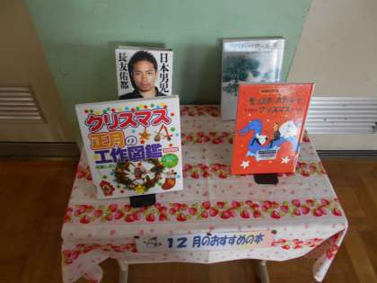 図書館の前には,12月のおすすめの本が並び,