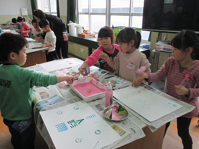 はじめは,どんな形が写されるのか、絵の具の量はどれぐらいつければよいかを,試行錯誤しながら作品を作っています。