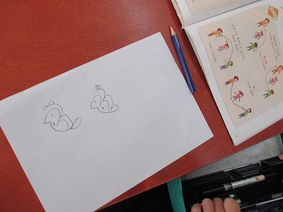 「さんちゃんが」の絵かき歌をしました。はじめはCDの速さについて絵を描くことが難しく,自分がかける速さで歌いながら,それぞれが描きました。最後には,CDに合わせて絵を描くことができました。