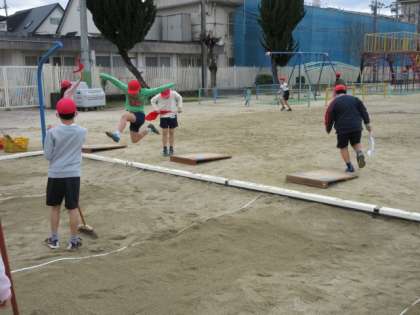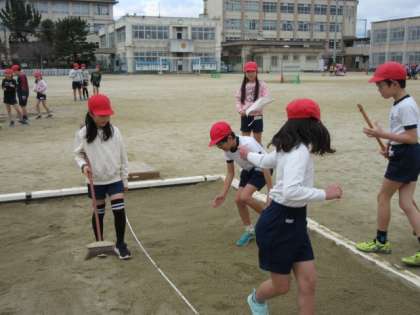幅跳びでは,助走や踏み切りを工夫して跳んでいます。友だちと役割を交代しながらスムーズに記録することができました。
