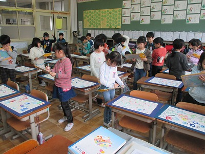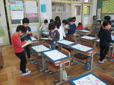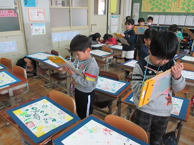 仕上がった版画を鑑賞しました。友達の素敵なところを見つけ,カードに書きました。