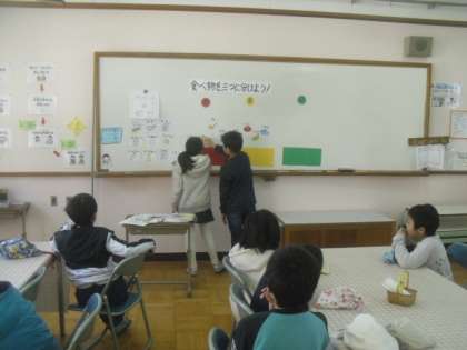 ランチルームにて,栄養教諭から食の指導を受けました。食べ物のはたらきを分類して考えました。
