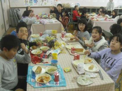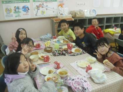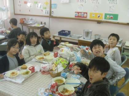 食の指導後,みんなで楽しくランチルームで給食を食べました。