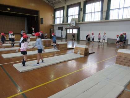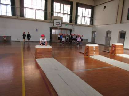 体育では,とび箱運動をしています。もうすぐできそうな技や高さに挑戦しています。成功できるように友だち同士でアドバイスを掛けあいながら練習に取り組んでいるところです。