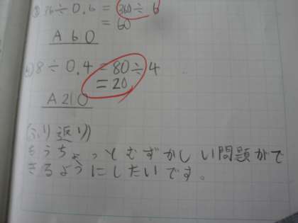 小数÷小数の単元を学習しています。かける数とかけられる数を10倍してから計算すると,簡単にできることを学びました。最初は戸惑っていた子どもが中にはいましたが,こつを掴むと,どんどん問題を解いていきました。