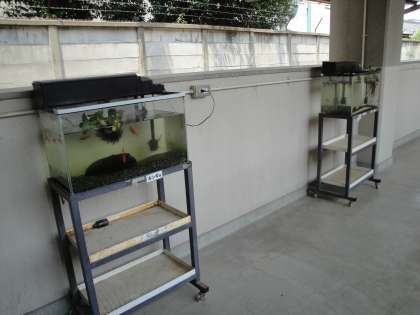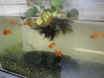 北校舎と西校舎の1階渡り廊下に,かわいい金魚がいます。水草の間をすいすい泳ぐ姿に,子どもたちはうっとりしています。