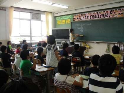 2時間目は,どのクラスも外国語活動でした。じゃんけんや1〜20までの数の数え方を電子黒板機能付き大型TVを見ながら学習しました。