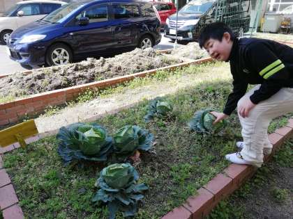 みんなが がんばって おせわしていた キャベツが とてもおおきく なりました。つぎに がっこうに きたときに キャベツをみてください。あおむしが かんさつ できると うれしいですね。