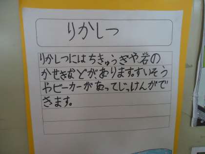 ここは,りかしつ です。1ねん1くみの きょうしつの むかいに あります。3ねんせいから りかの きょうかが はじまります。じっけんをするときに ここの きょうしつで ようぐを つかって がくしゅうします。きょうしつの つくえよりも おおきいつくえです。ぐるうぷで すわって がくしゅうします。いすや こくばんが きょうしつに あるのと ちょっと ちがって いますね。