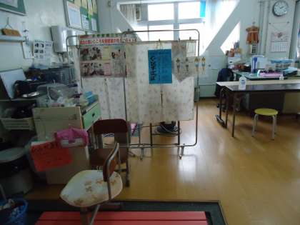 ここには,たにみずせんせいが おられます。 からだのおおきさを はかったり めや みみ はななど、からだを けんさしたりするときに きます。がっこうで けがをしたときや しんどくなったときにも くるところです。けがしたときは,じぶんのがくねん・くみ・なまえを いってから どこを けがしたかを つたえるように しましょう。