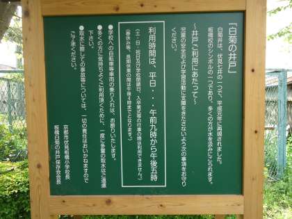がっこうの せいもんよこに ちいさなもんが あります。 ここは,むかしむかしから わきみずが わいています。「しらぎくの いど」とか「しらぎくい」などと よばれています。とても きれいな みずがわいています。ふしみの ななめいすいのひとつに なっています。ふしみには,ななつの きれいな みずが わいていました。 ちかくの ごこうぐうにも わきみずが わいています。しっていましたか?