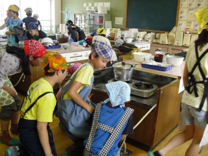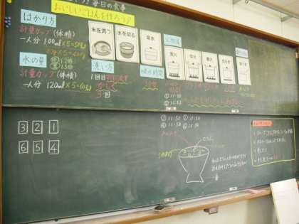 『見直そう毎日の食事』の学習の中で,お米の吸水実験をした後,炊飯器ではなく,ガスを使って鍋でお米を炊く実習をしました。水加減や火加減・時間に気をつけながらみんなで炊いたご飯は,ふっくらとしてとてもおいしいものになっていました。