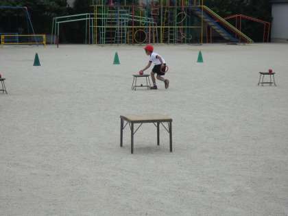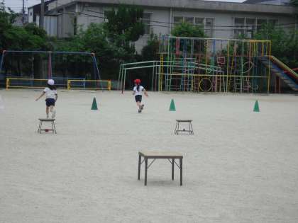 体育の授業ではおきかえリレーをしています。ただ走るだけではなく、ボールを台から台へと動かしながら走ります。今日は4チームに分かれて競争しました。「がんばれ〜!」「ファイト!!」と、みんな自分のチームを一生懸命応援していました。来週からのプール学習までは、おきかえリレーを行います。