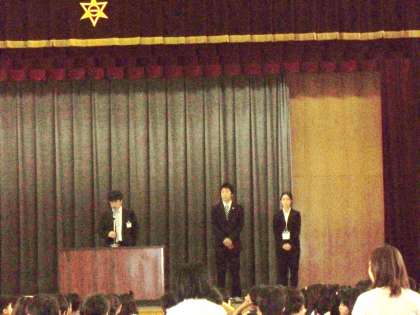 音楽委員会から6月の全校合唱「みんなともだち」の紹介がありました。続いて,教育実習生の先生方が自己紹介を行いました。