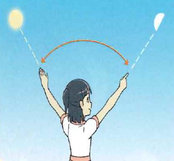3.両うでを前に伸ばして,右手の指で「月」をさし,左手の指で「太陽」をさします。両うでの開き具合で,月と太陽がどれくらいはなれているかを確認しましょう。観察カードに気付いたことを書きましょう。