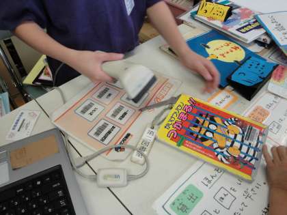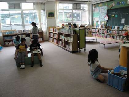 休み時間の図書室は子どもたちの憩いの場です。本の貸し出しや返却は,図書委員や地域ボランティアの方によって行われます。