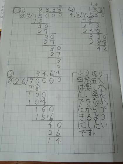 わり切れない場合の計算について,わり算の答えを四捨五入して1/10の位までの概数で表すことを学習しました。子どもたちは,四捨五入をして計算をすると答えが求められることを,学習を通して発見していました。