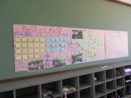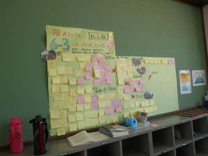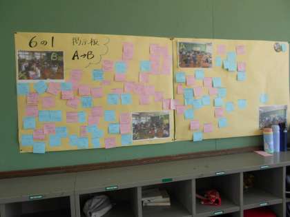 分散登校のため,A班とB班の子ども達は会えていません。6年生は,クラスの仲間の心を一つに繋ぐために,会えていないグループの子ども達にメッセージを残しています。お互いに書いてくれたメッセージを読み,自分の思いを次の日のメンバーに向けて書いています。A→B→A→B→A→B→Aと続いているメッセージは6枚目になっています。