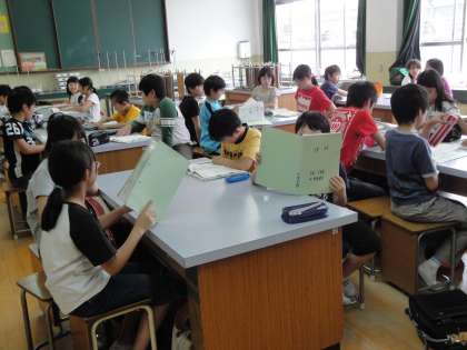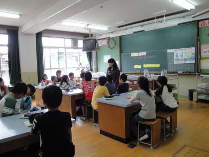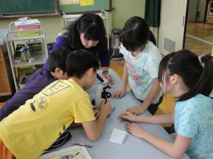 「メダカのたんじょう」の学習で,顕微鏡を使って水中の微生物を調べています。倍率をうまく合わせ,真剣な眼差しで観察をしていました。