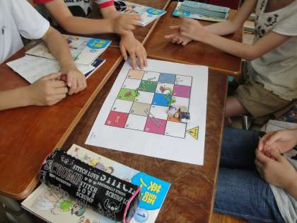 次に,すごろく版を使って,スネークス・アンド・ラダースゲームをしました。自分の駒が止まった場所で,1〜20の数字を声に出して班の友だちと確認していきました。