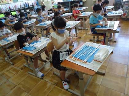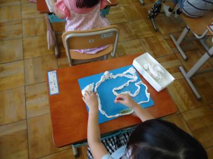 長い長い 粘土を作って,いろいろなものを 作りました。蚊取り線香やトンネルなどと 題名を つけて 楽しんでいました。